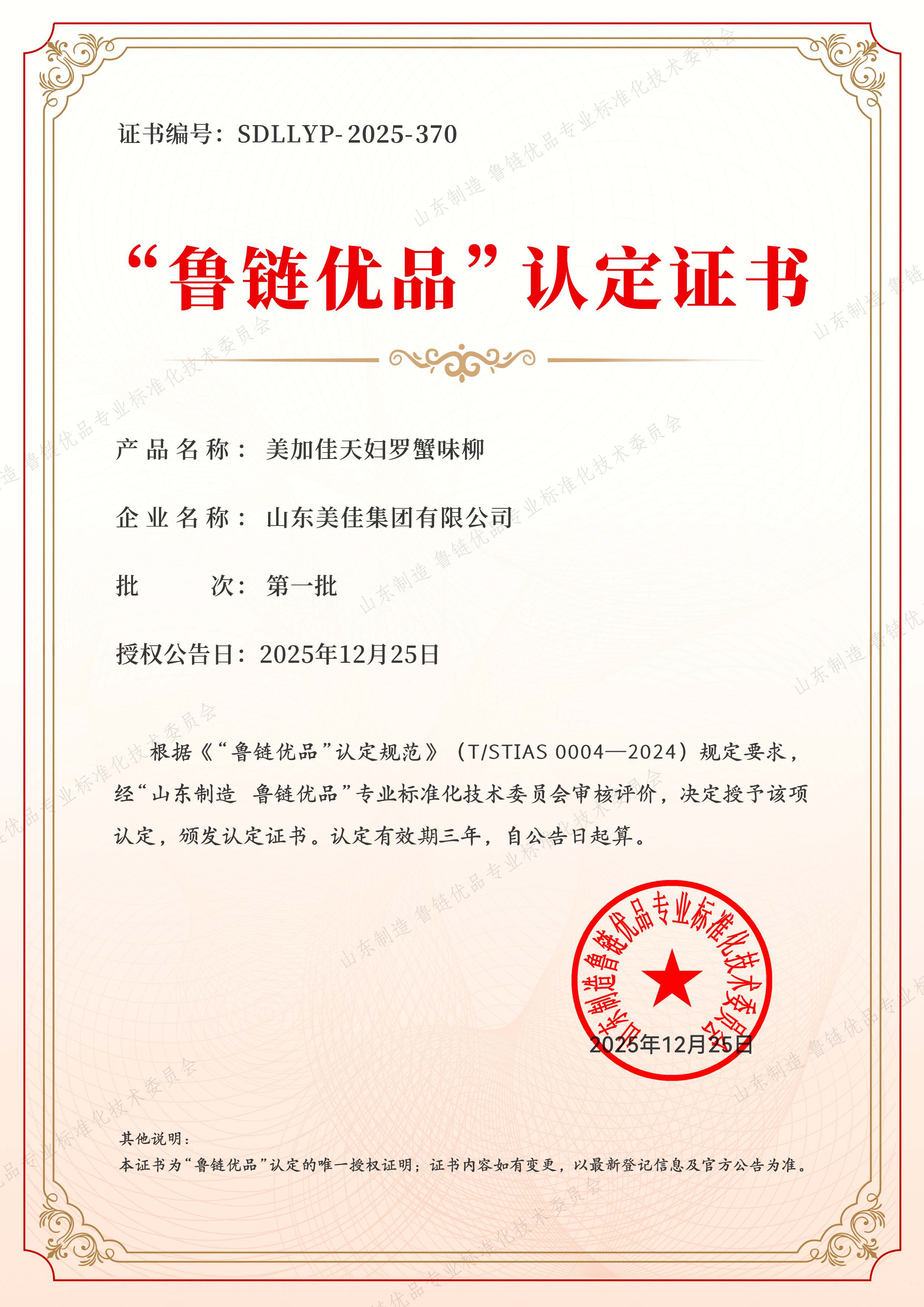 近日,山東省工業和信息化廳公示2025年首批“山東制造 魯鏈優品”名單,美佳集團的“美加佳”天婦羅蟹味柳成功入選。這一榮譽既是對美佳集團產品實力的權威認證,更是對企業在食品加工領域深耕細作、創新發展的高度肯定。